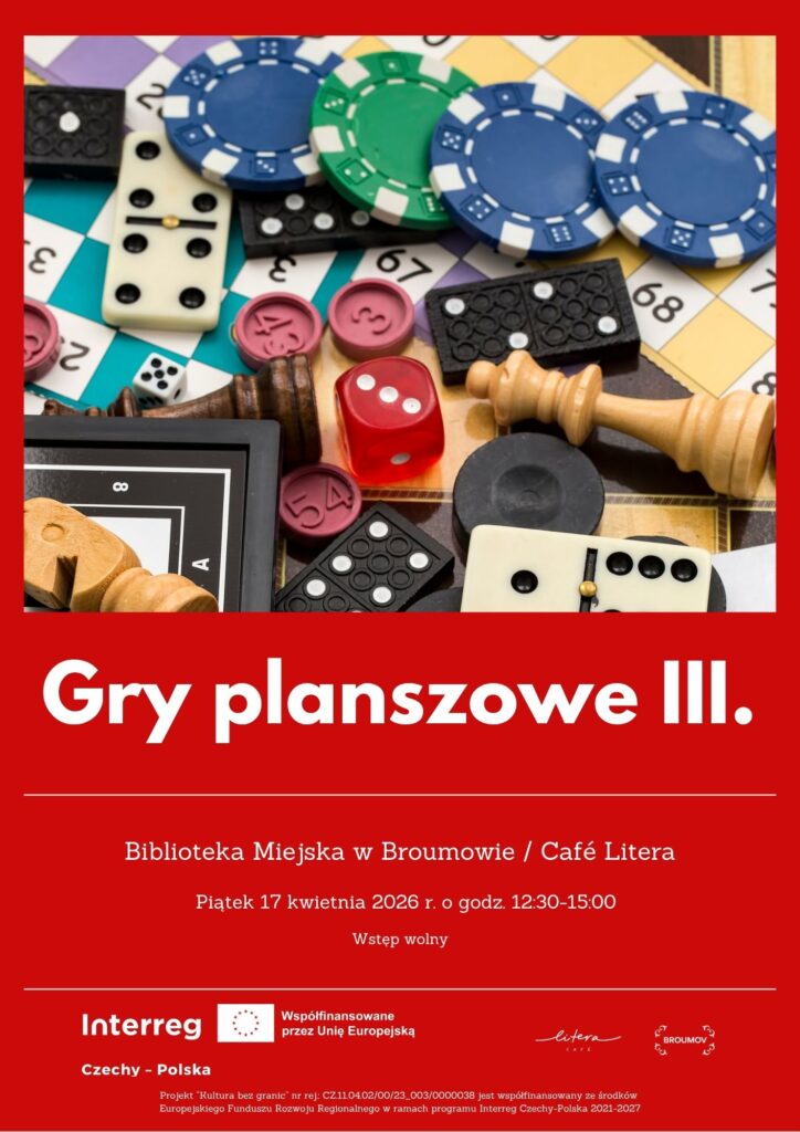 W piątek 20.12.2024 r., w godz. 10:00–13:00 nasi partnerzy w polsko-czeskim projekcie „Kultura bez granic” zapraszają osoby z obu stron granicy do Broumova na sesję gier planszowych. Wstęp wolny.